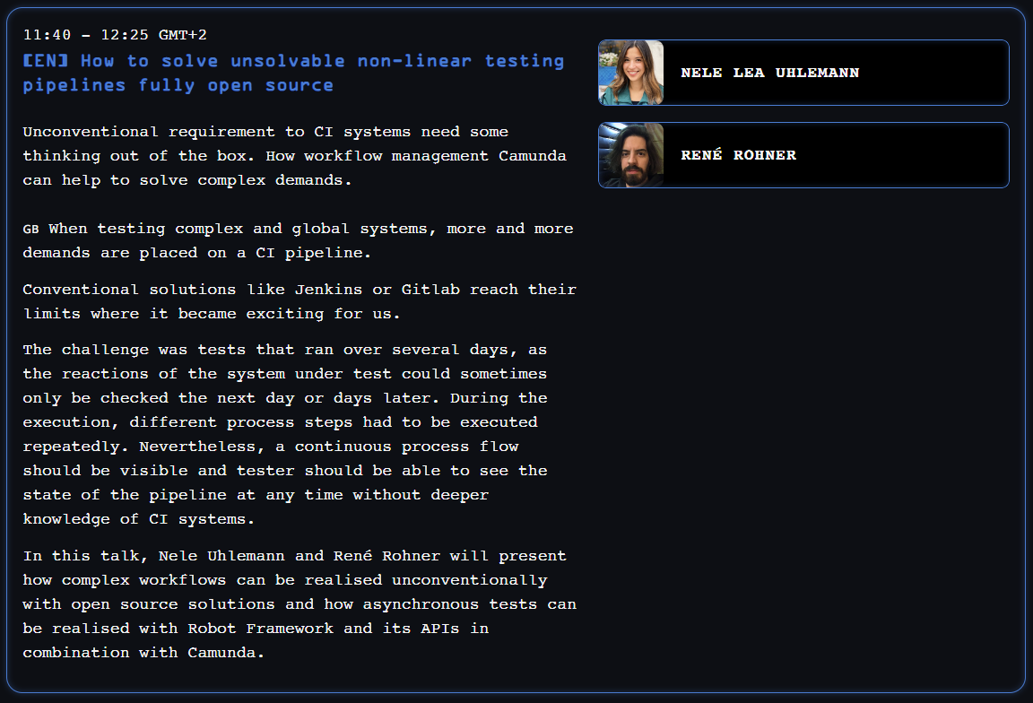 Markus gave also a reference for managing complicated test flows with Camunda, which might be a use case for the energy projects at Arvato Systems where distributed 3rd party system are required for testing internal application. Test automation in banking has the same challenge. A use case how to handle long running test cases with Camunda will be presented at RoboconDE during QS Tag in first week of October.